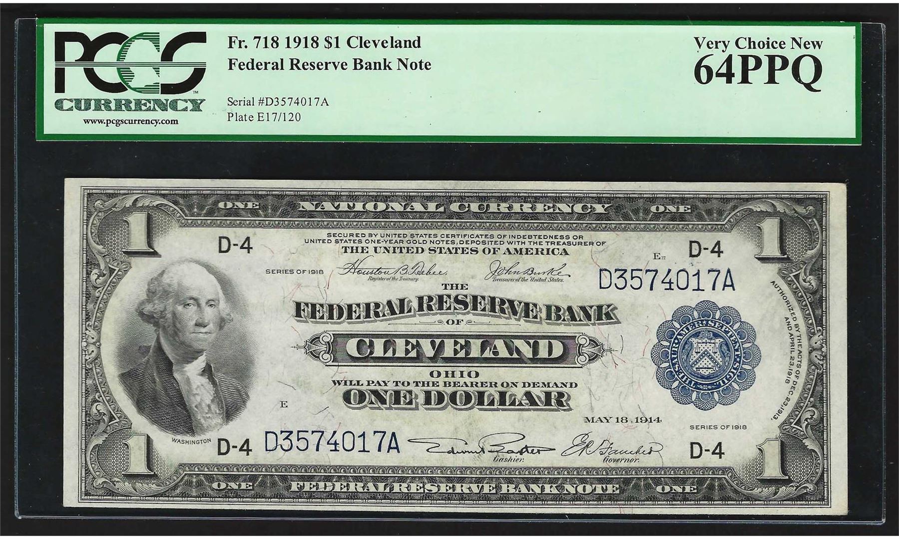 One 1918 $1 Federal Reserve Bank Note Cleveland PCGS Very Choice New 64PPQ. PCGS Graded.