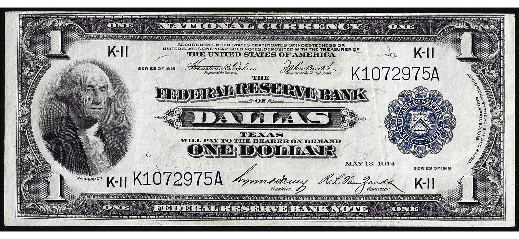 One 1918 $1 Federal Reserve Bank Note Dallas.