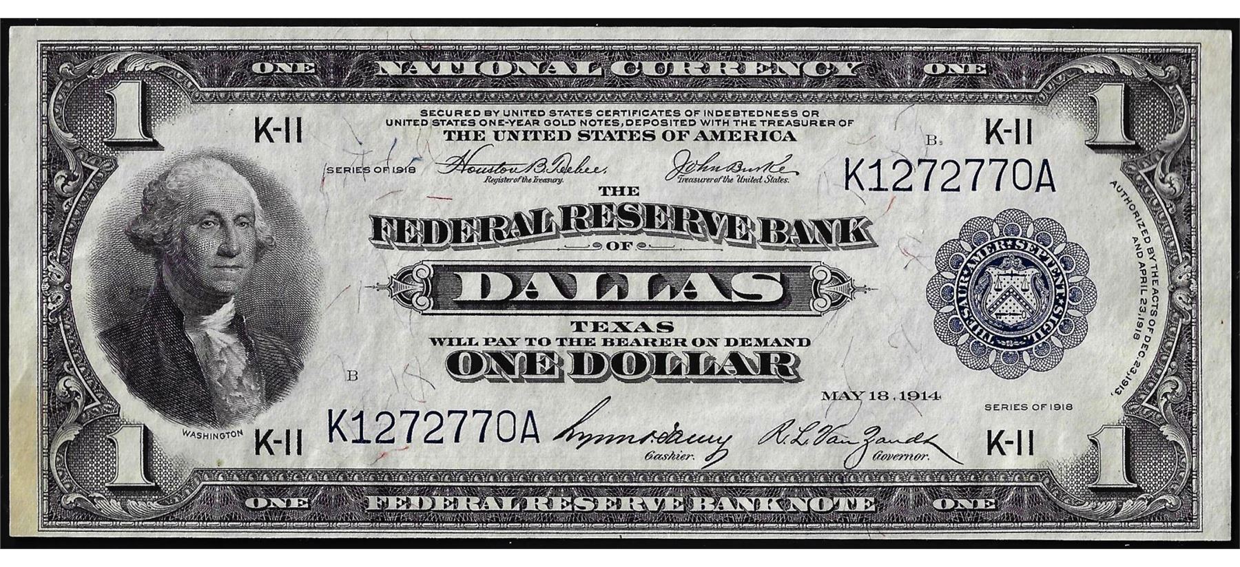 One 1918 $1 Federal Reserve Bank Note Dallas.