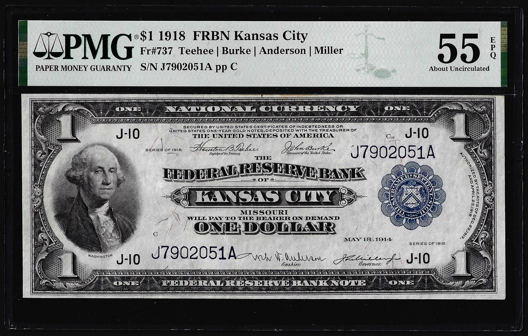 1918 $1 Federal Reserve Bank Note Kansas City Fr.737 PMG About Uncirculated 55EPQ