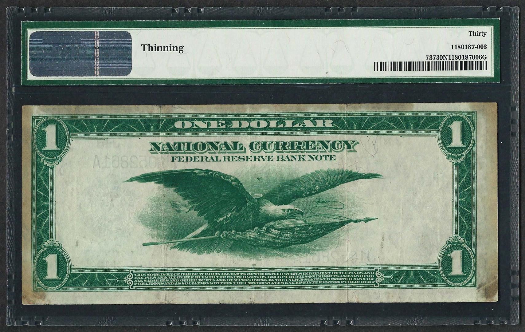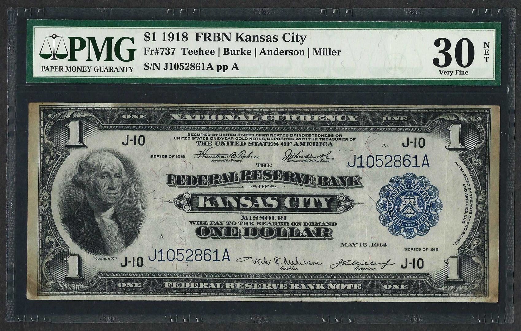 One 1918 $1 Federal Reserve Bank Note Kansas City Fr.737 PMG Very Fine 30 Net. PMG Certified.