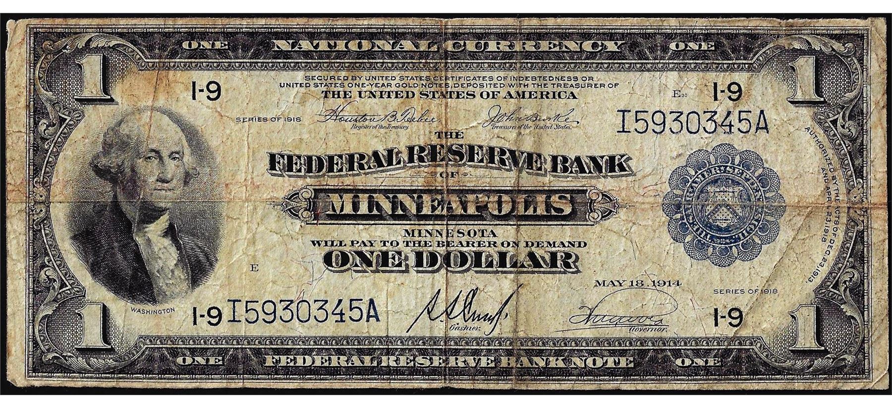 One 1918 $1 Federal Reserve Bank Note Minneapolis.