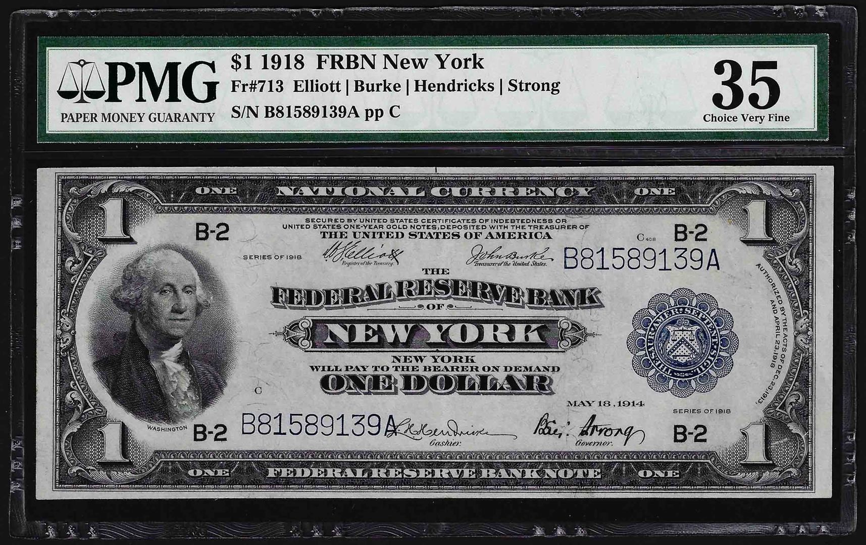 One 1918 $1 Federal Reserve Bank Note New York Fr.713 PMG Choice Very Fine 35. PMG Certified.
