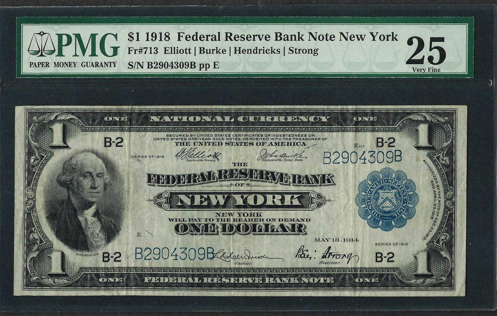 One 1918 $1 Federal Reserve Bank Note New York Fr.713 PMG Very Fine 25. PMG Certified.