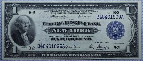 1918, 1 Federal Reserve Bank Note, New York. S/N B48401899A pp C. Teehee / Burke / Hendricks / Strong. PMG graded Choice About Uncirculated 58.