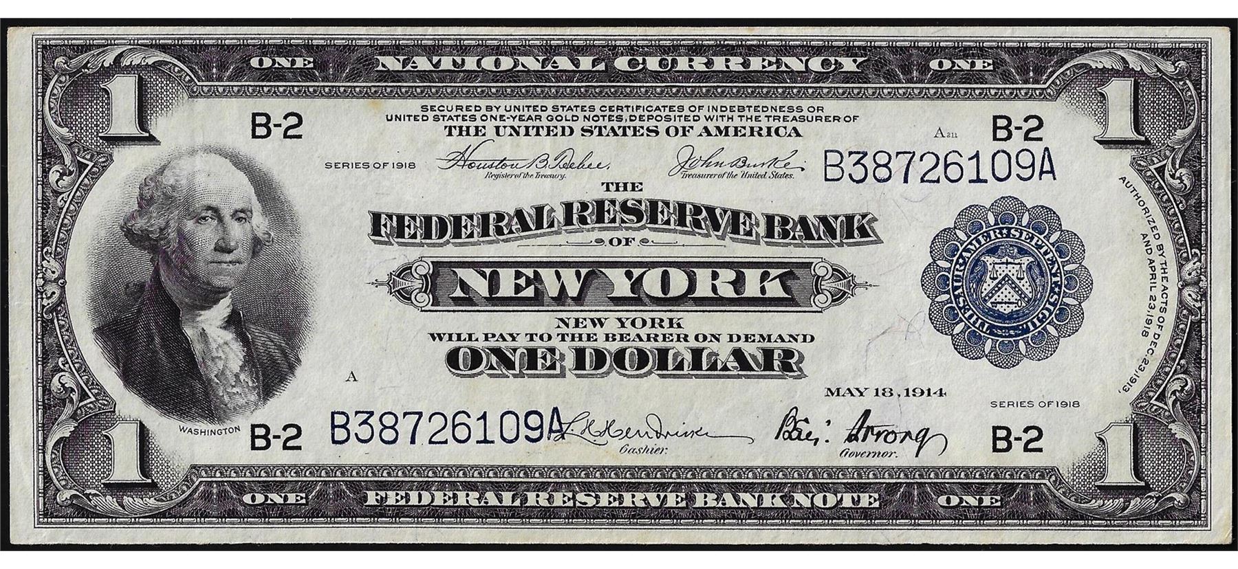 One 1918 $1 Federal Reserve Bank Note New York.