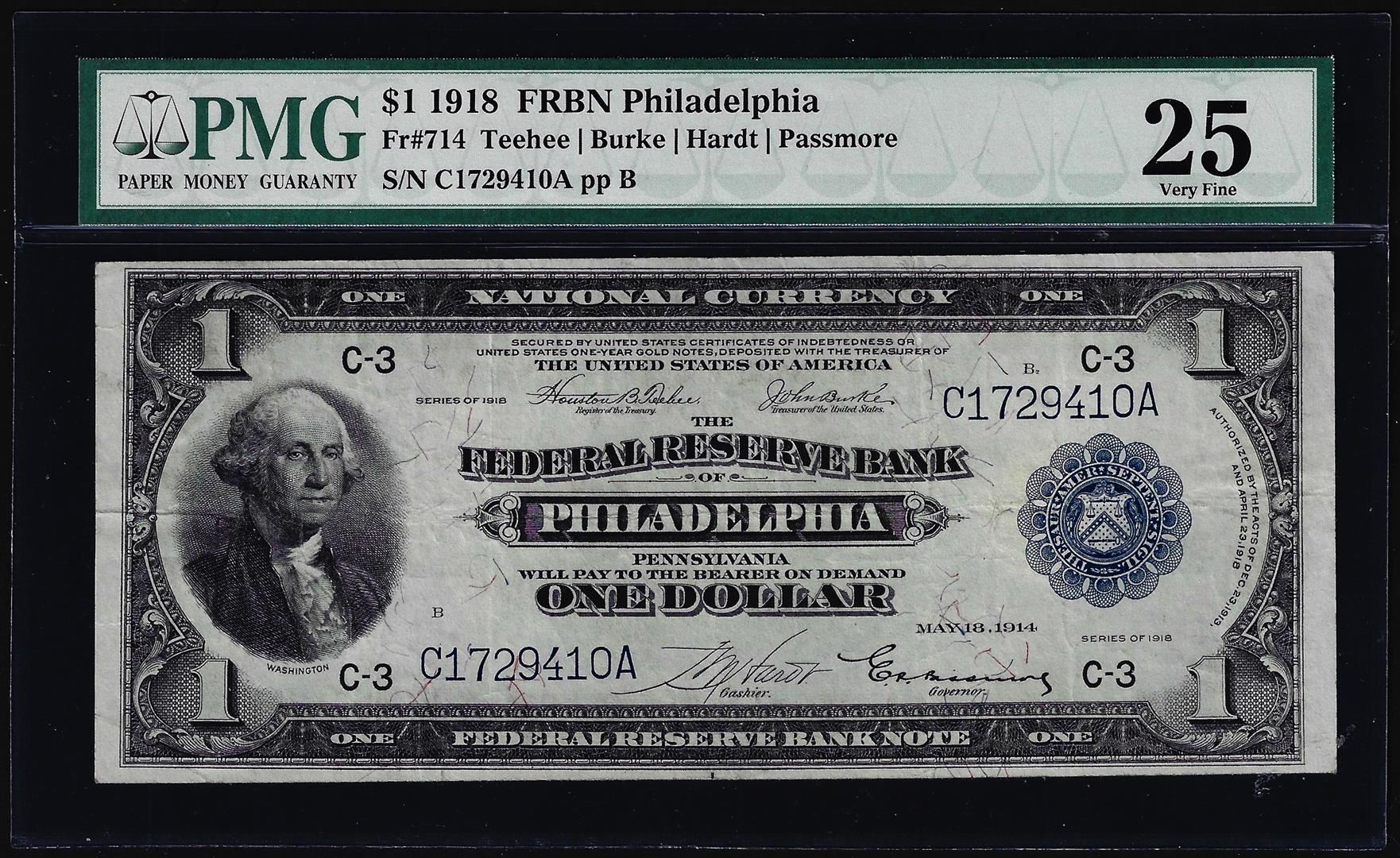 One 1918 $1 Federal Reserve Bank Note Philadelphia Fr.714 PMG Very Fine 25 . PMG Certified.