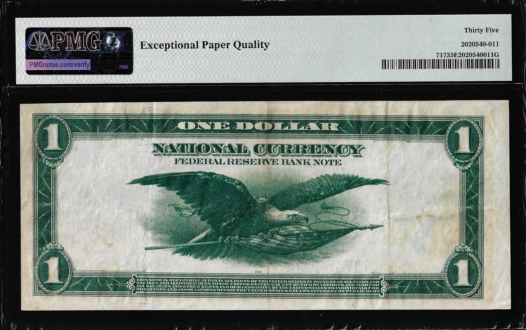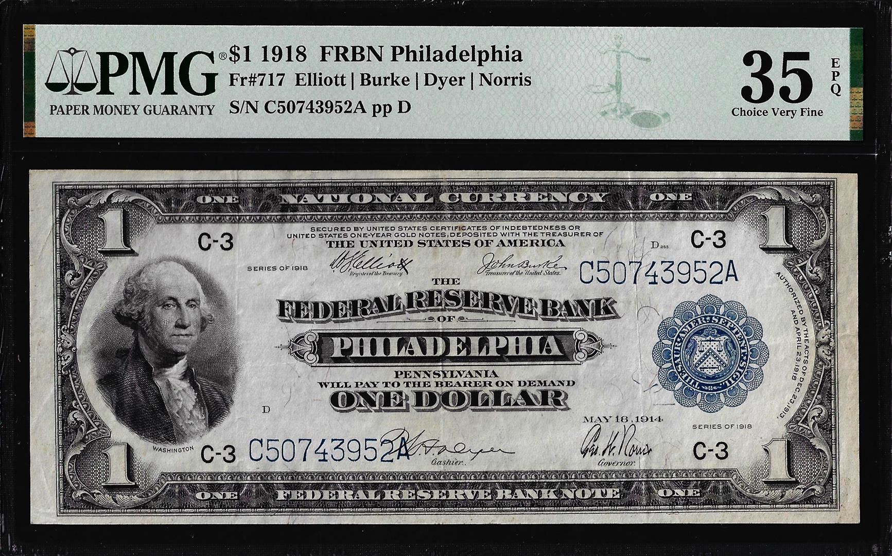 One 1918 $1 Federal Reserve Bank Note Philadelphia Fr.717 PMG Choice Very Fine 35EPQ. PMG Certified.