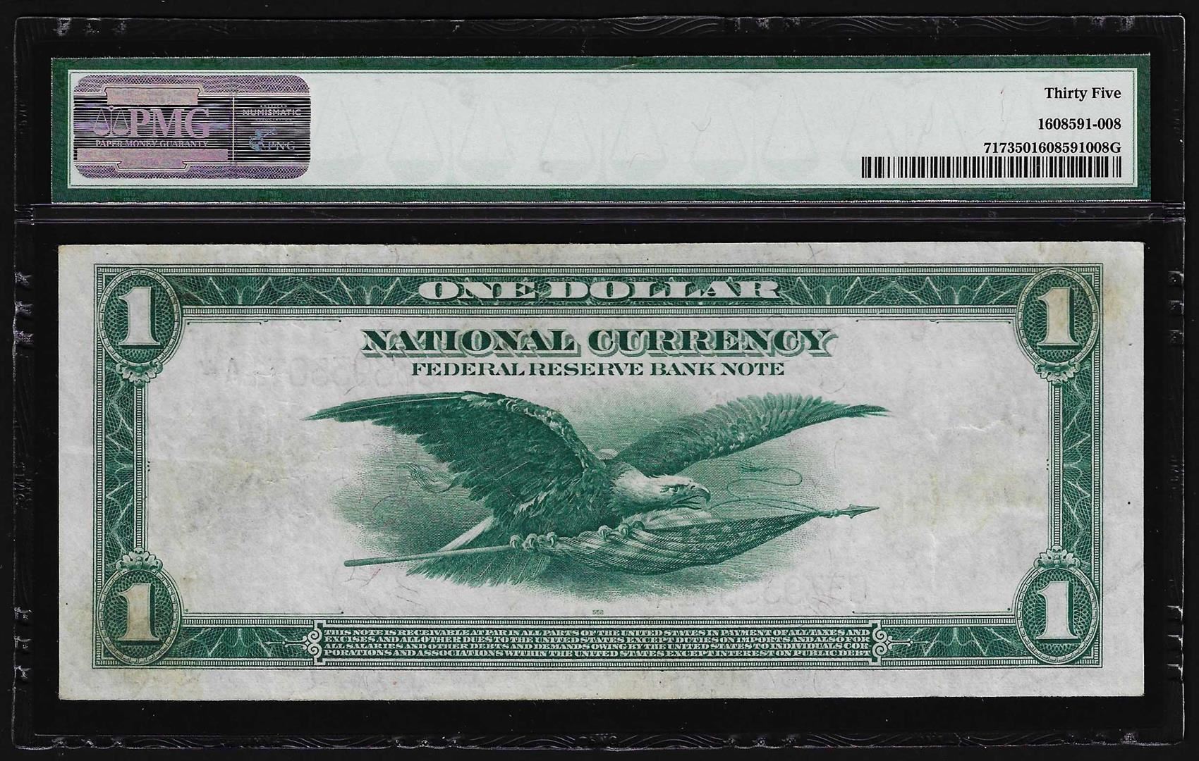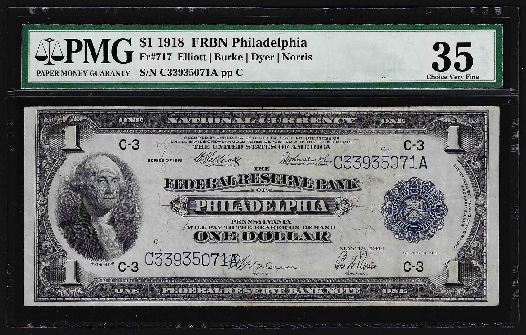 One 1918 $1 Federal Reserve Bank Note Philadelphia Fr. 717 PMG Choice Very Fine 35. PMG Certified.