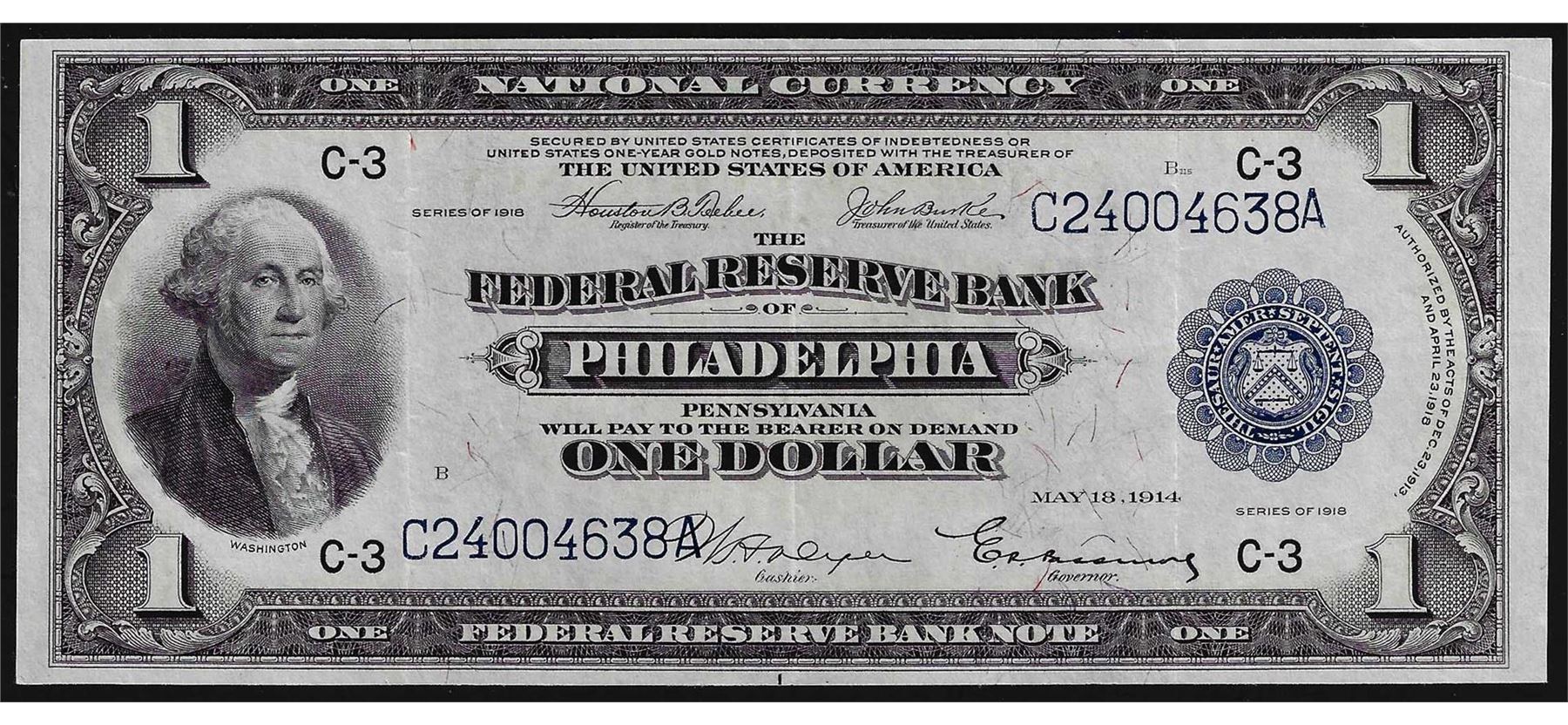 One 1918 $1 Federal Reserve Bank Note Philadelphia.