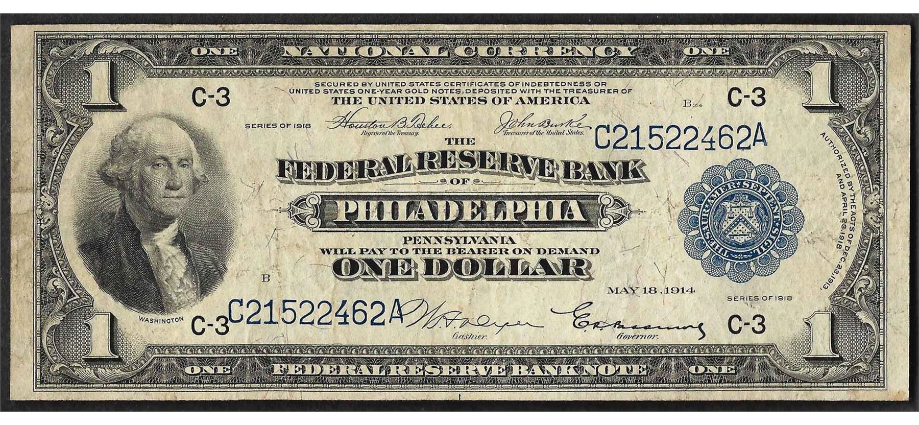 One 1918 $1 Federal Reserve Bank Note Philadelphia.