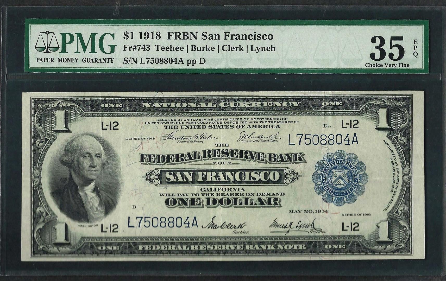 One 1918 $1 Federal Reserve Bank Note San Francisco Fr.743 PMG Choice Very Fine 35EPQ. PMG Certified.