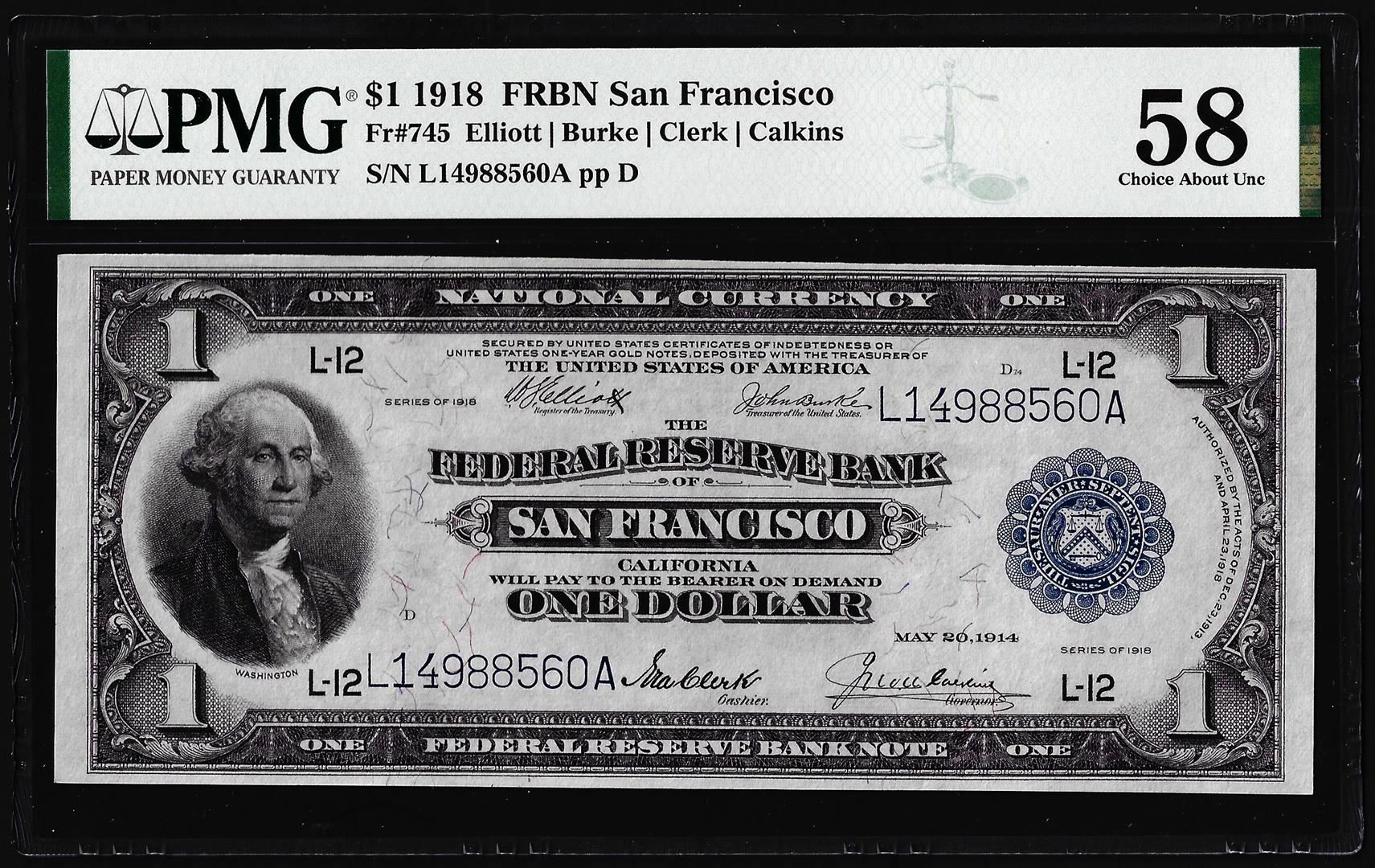 1918 $1 Federal Reserve Bank Note San Francisco Fr.745 PMG Choice About Unc. 58