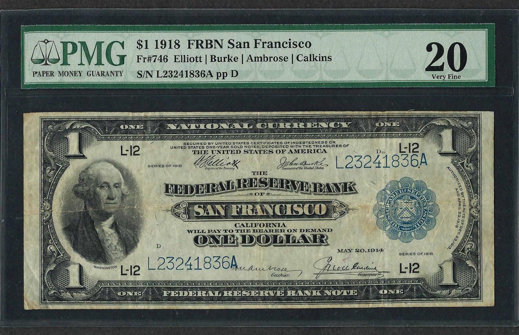 One 1918 $1 Federal Reserve Bank Note San Francisco Fr.746 PMG Very Fine 20. PMG Certified.