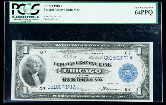 1918, $1 Federal Reserve Bank Note. Very Choice New 64PPQ. . Fr-729. This lovely Chicago district note has excellent punch-through embossing and incredible originality that can be see through the holder and makes the note look as fresh as the day it was printed.