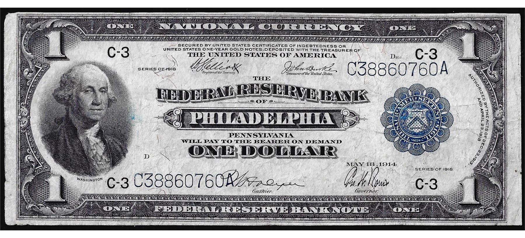 One 1918 $1 Federal Reserve Bank of Philadelphia Note.