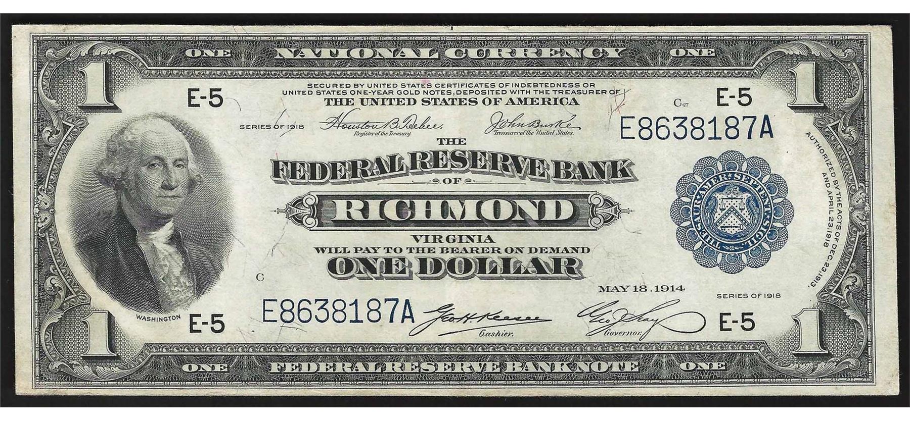 One 1918 $1 Federal Reserve Bank of Richmond National Currency Note.