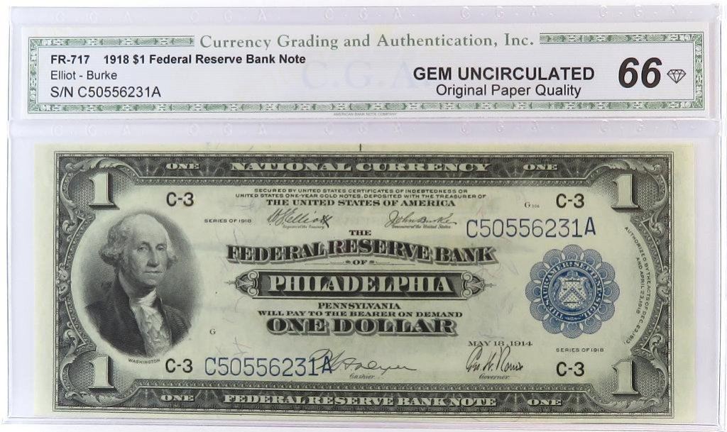 1918 $1 Federal Reserve Note - Philadelphia. FR# 717. CGA Certified GU66.