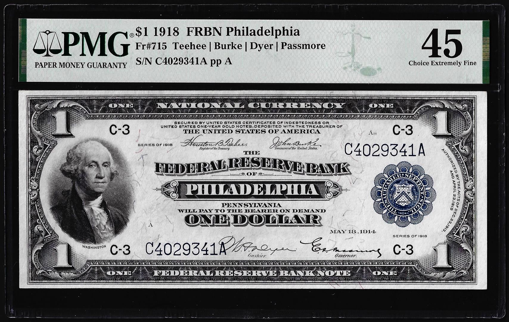 One 1918 $1 Federal Reserve Note Philadelphia Fr.715 PMG Choice Extremely Fine 45. PMG Certified.