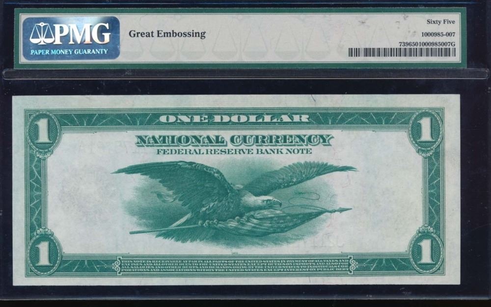 One 1918 $1 Kansas City Federal Reserve Bank Note PMG 65.
