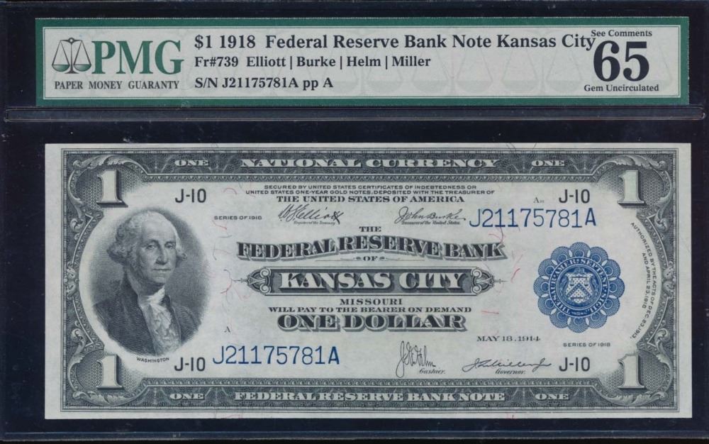 One 1918 $1 Kansas City Federal Reserve Bank Note PMG 65.