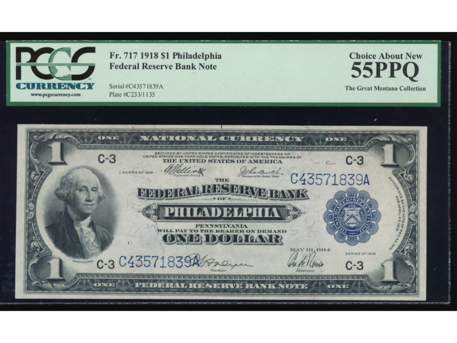 One 1918 $1 Large Philadelphia Federal Reserve Note PCGS 55PPQ.