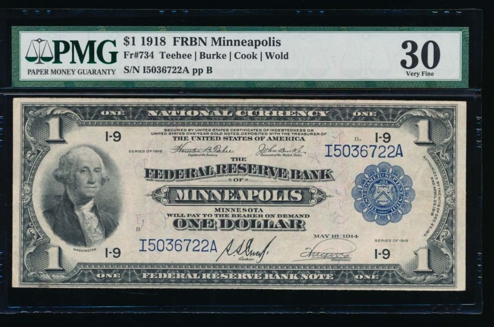 One 1918 $1 Minneapolis Federal Reserve Bank Note PMG 30.