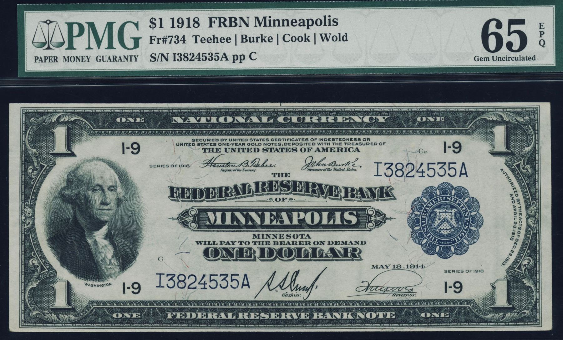 One 1918 $1 Minneapolis Federal Reserve Bank Note PMG 65EPQ.