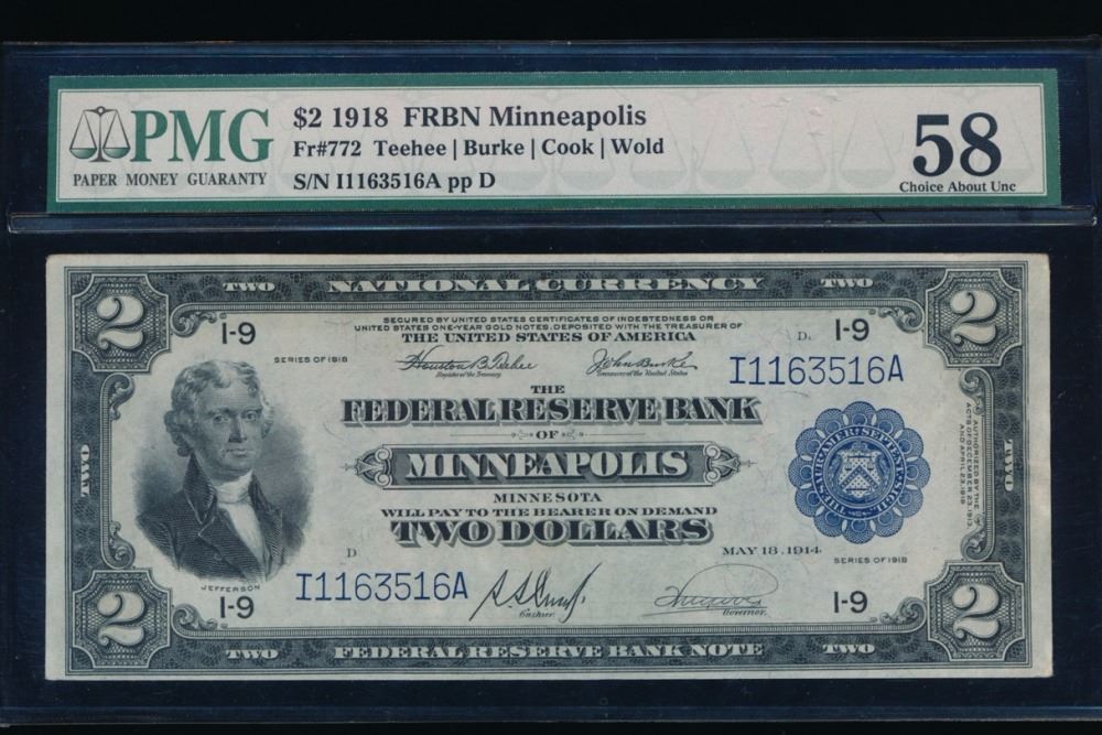 One 1918 $1 Minneapolis Large Federal Reserve Bank Note PMG 58.
