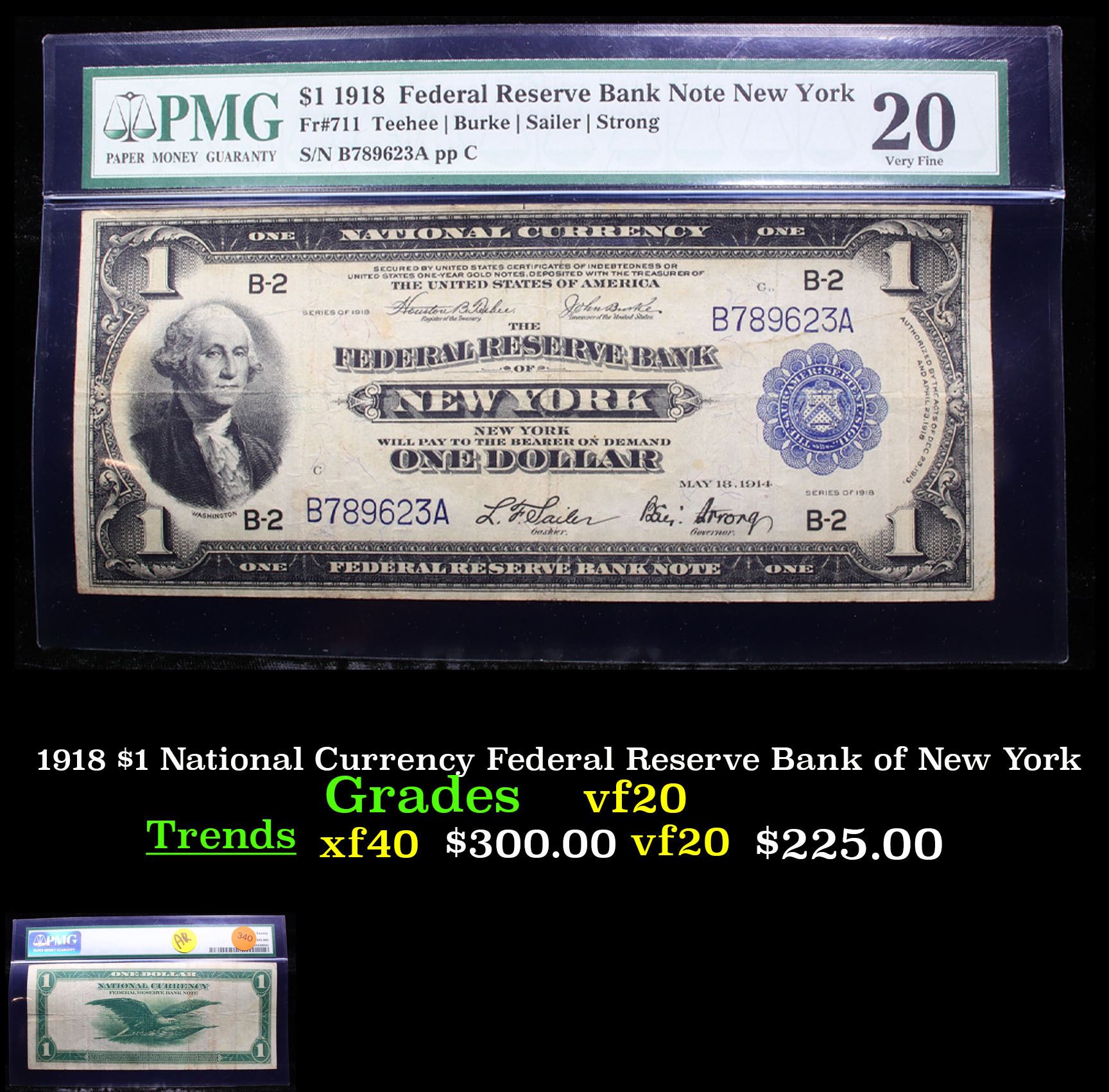 1918 $1 National Currency Federal Reserve Bank of New York Graded vf20 By PMG.        FR 711  There are three different years found on series of 1918 one dollar bills.  Despite also saying 1914 and 1913, these are referred to by collectors as 1918 federal reserve bank notes.  Collectors have given this note the nickname of the “Flying Eagle.”  The back of the note shows why the bill received its nickname.  Keep in mind that series of 1918 one dollar federal reserve bank notes were issued for 12 different banks.  The artwork will all be the same though.  George Washington is on the left hand side of the bill.  There is a blue seal on the right hand side of the bill and the serial numbers are in blue ink.  Signatures Teehee & Burke for the Treasury.  Hendricks & Strong for New York.  In total there are 39 different signature combinations for 1918 one dollar federal reserve notes