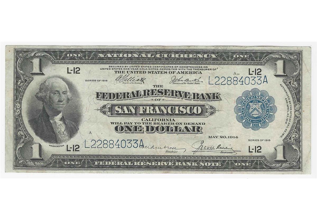 One 1918 $1 National Currency Federal Reserve Bank of San Francisco Note.