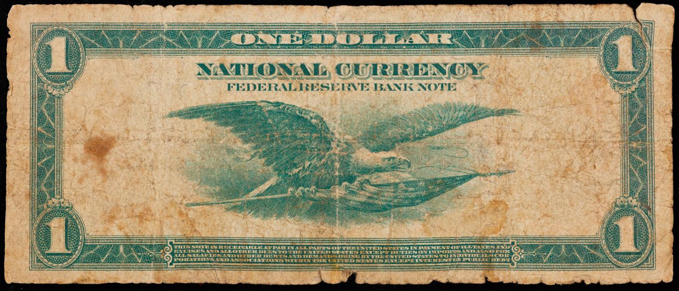 1918 $1 National Currency "Flying Eagle" Federal Reserve Bank of Chicago, IL Fr-728, Sig. Teehee, Burke, Cramer, McDougal Grades f+. There are three different years found on series of 1918 one dollar bills. Despite also saying 1914 and 1913, these are referred to by collectors as 1918 federal reserve bank notes. Collectors have given this note the nickname of the “Flying Eagle.” The back of the note shows why the bill received its nickname. Keep in mind that series of 1918 one dollar federal reserve bank notes were issued for 12 different banks. The artwork will all be the same though. George Washington is on the left hand side of the bill. There is a blue seal on the right hand side of the bill and the serial numbers are in blue ink.