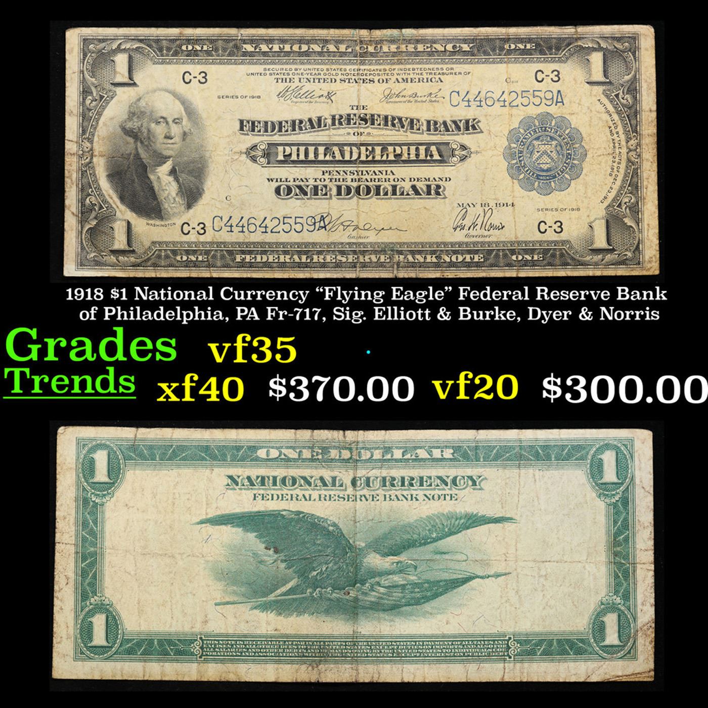 1918 $1 National Currency "Flying Eagle" Federal Reserve Bank of Philadelphia, PA Fr-717, Sig. Elliott & Burke, Dyer & Norris Grades vf++. There are three different years found on series of 1918 one dollar bills. Despite also saying 1914 and 1913, these are referred to by collectors as 1918 federal reserve bank notes. Collectors have given this note the nickname of the “Flying Eagle.” The back of the note shows why the bill received its nickname. Keep in mind that series of 1918 one dollar federal reserve bank notes were issued for 12 different banks. The artwork will all be the same though. George Washington is on the left hand side of the bill. There is a blue seal on the right hand side of the bill and the serial numbers are in blue ink.