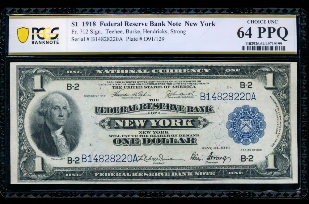 One 1918 $1 New York FRBN PCGS 64PPQ.
