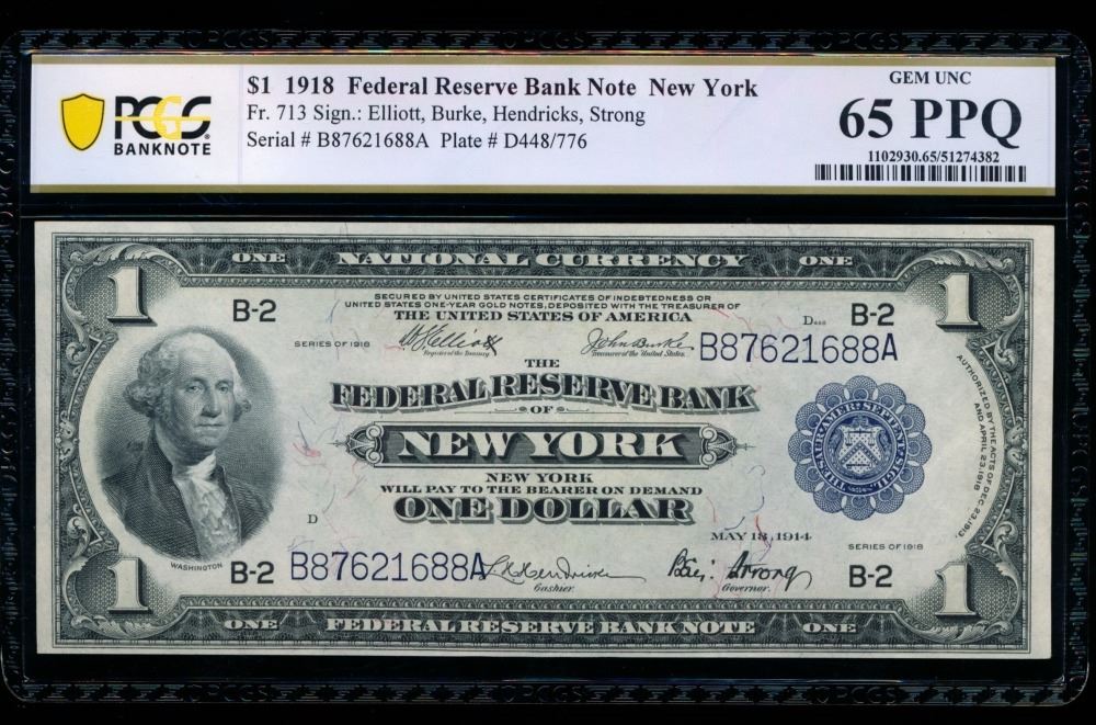 One 1918 $1 New York FRBN PCGS 65PPQ.