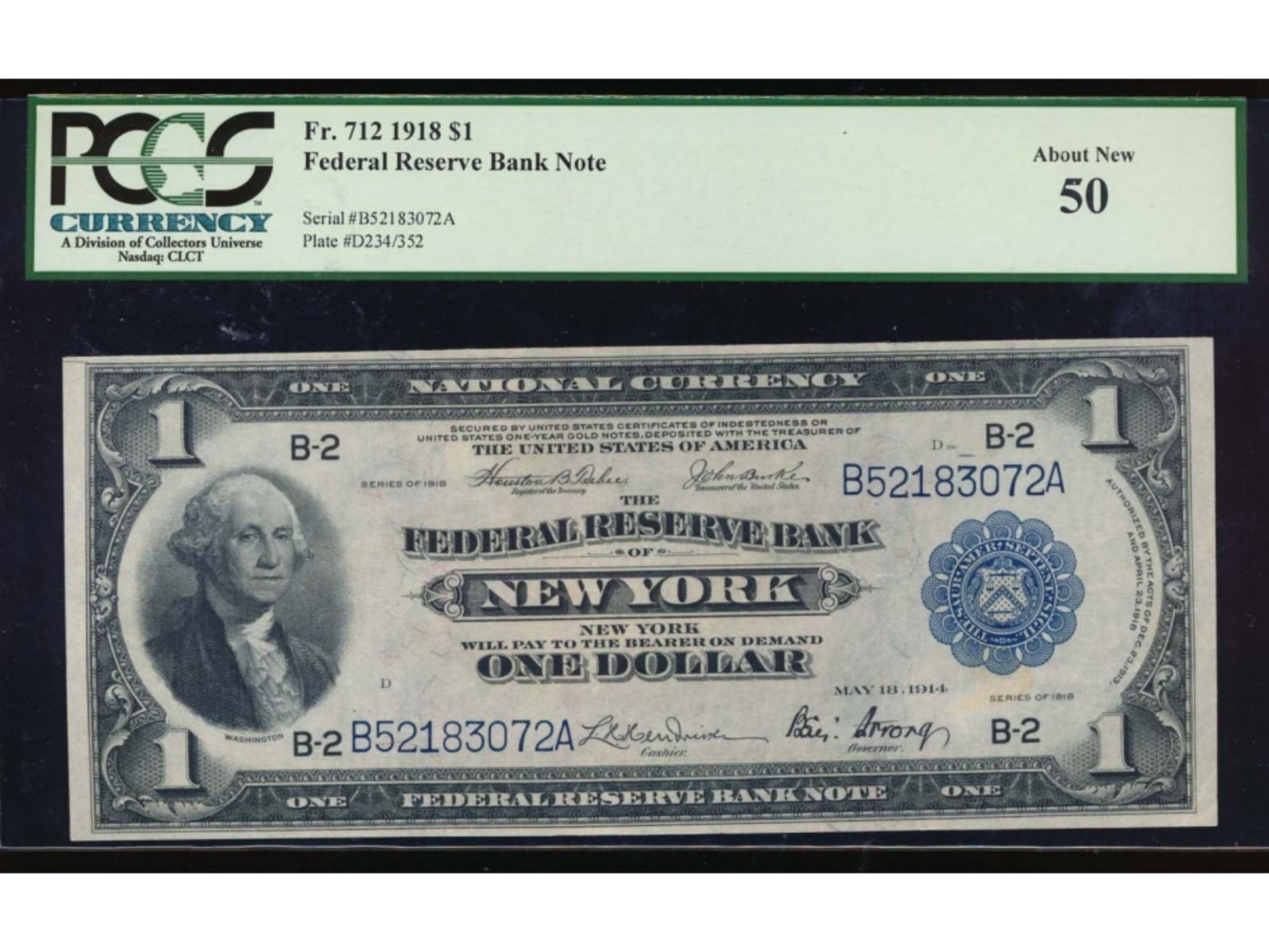 One 1918 $1 New York Federal Reserve Bank Note PCGS 50.