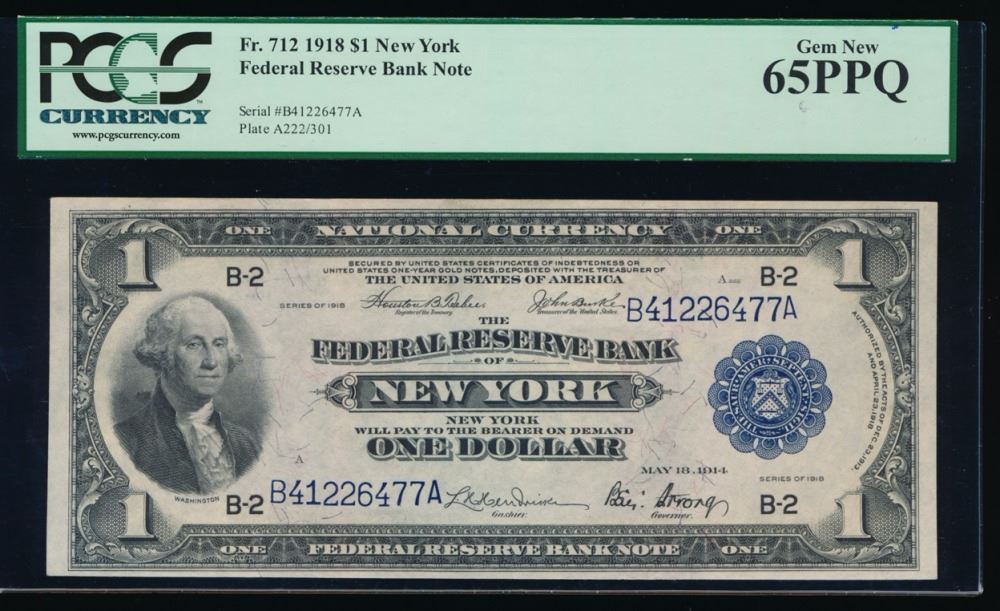 One 1918 $1 New York Federal Reserve Bank Note PCGS 65PPQ.