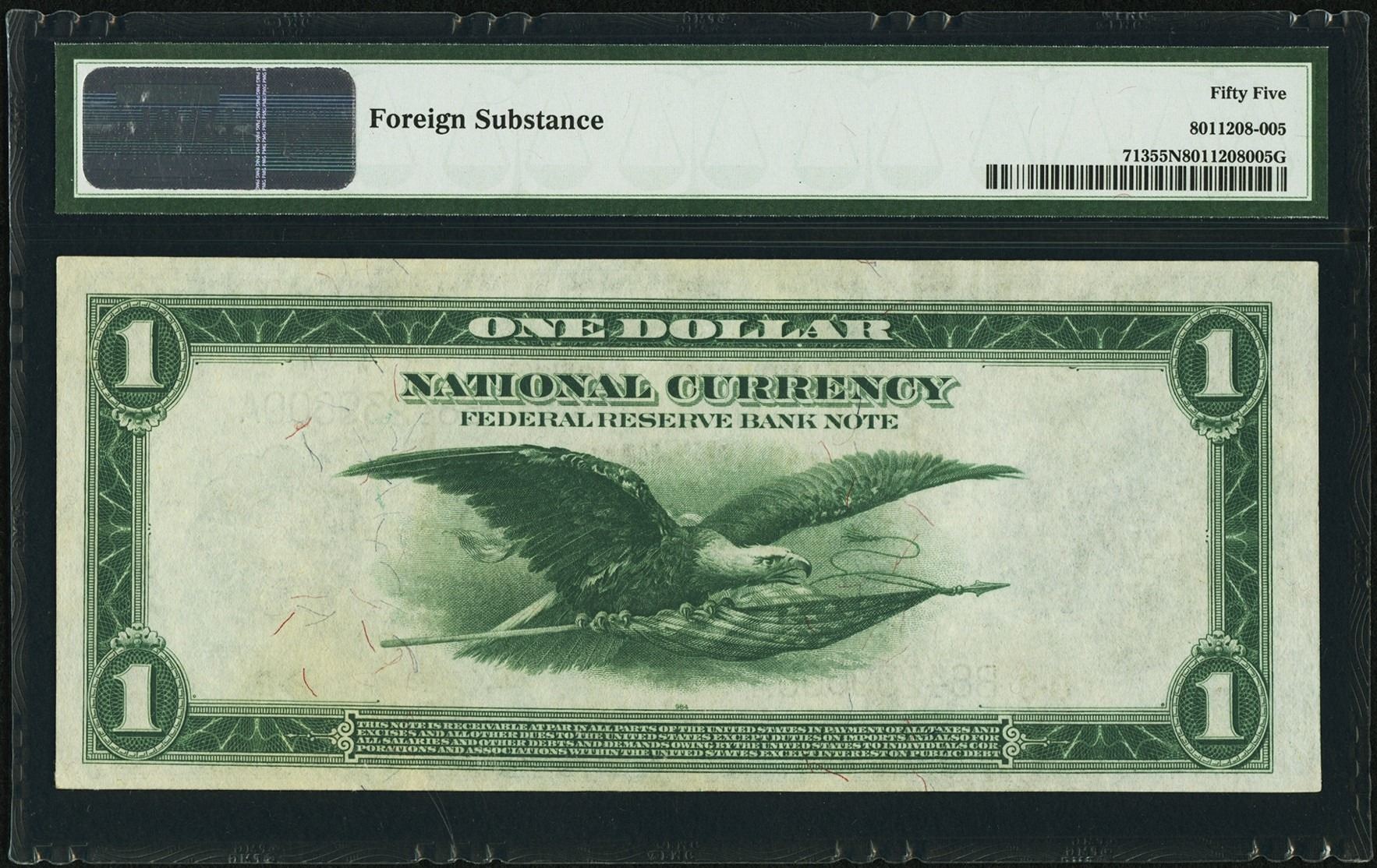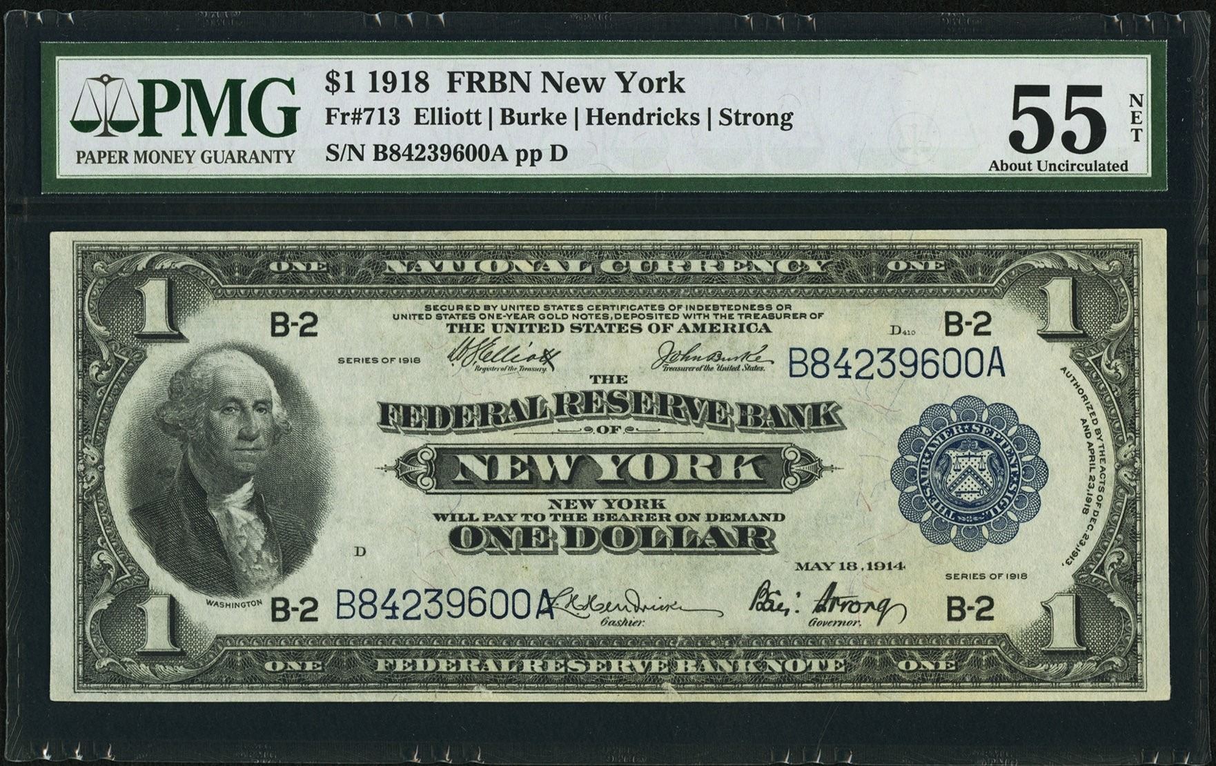 One 1918 $1 New York Federal Reserve Bank Note PMG 55NET.