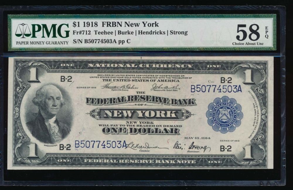 One 1918 $1 New York Federal Reserve Bank Note PMG 58EPQ.