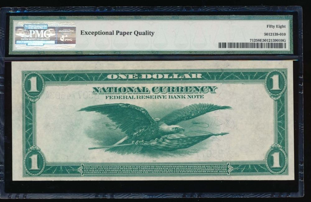 One 1918 $1 New York Federal Reserve Bank Note PMG 58EPQ.