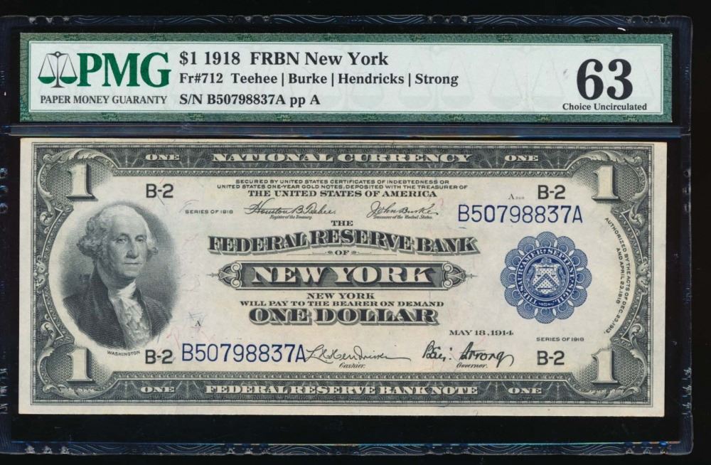 One 1918 $1 New York Federal Reserve Bank Note PMG 63.