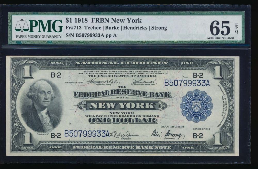 One 1918 $1 New York Federal Reserve Bank Note PMG 65EPQ.