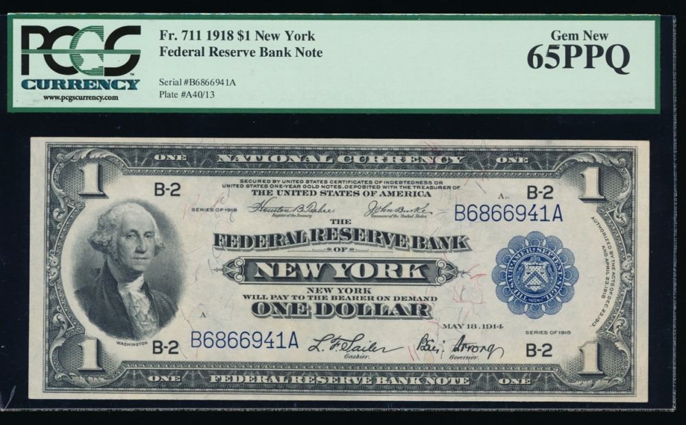 One 1918 $1 New York Large Federal Reserve Bank Note PCGS 65PPQ.