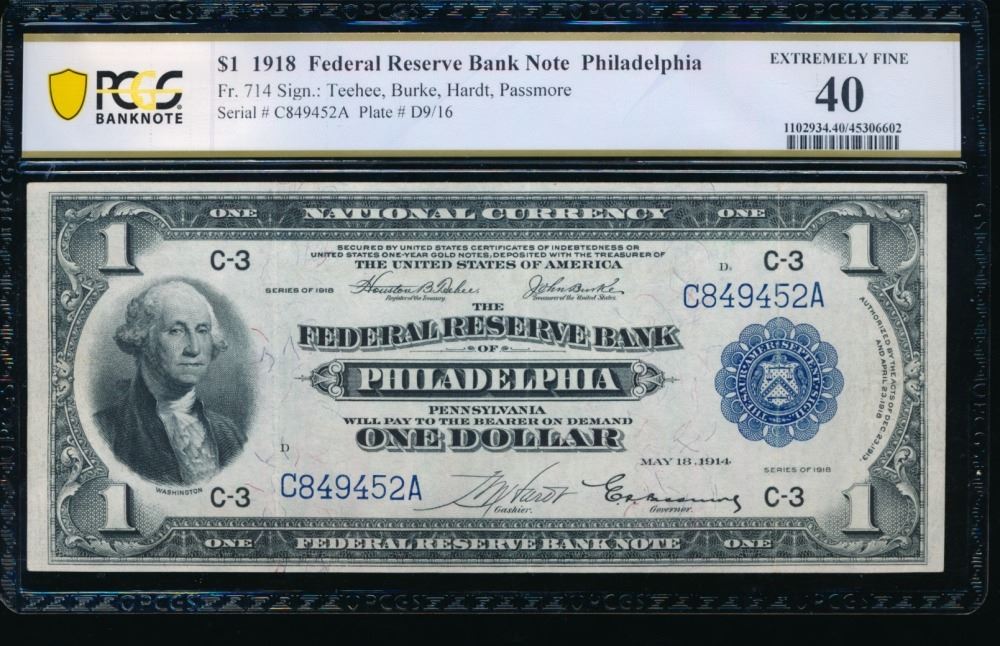 One 1918 $1 Philadelphia FRBN PCGS 40.