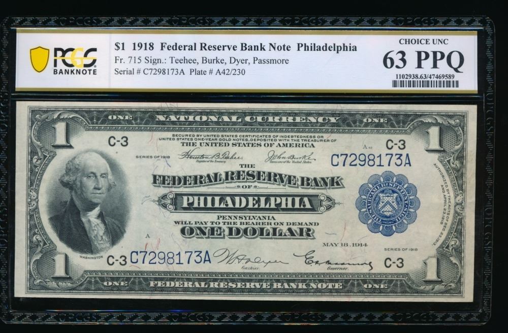 One 1918 $1 Philadelphia FRBN PCGS 63PPQ.