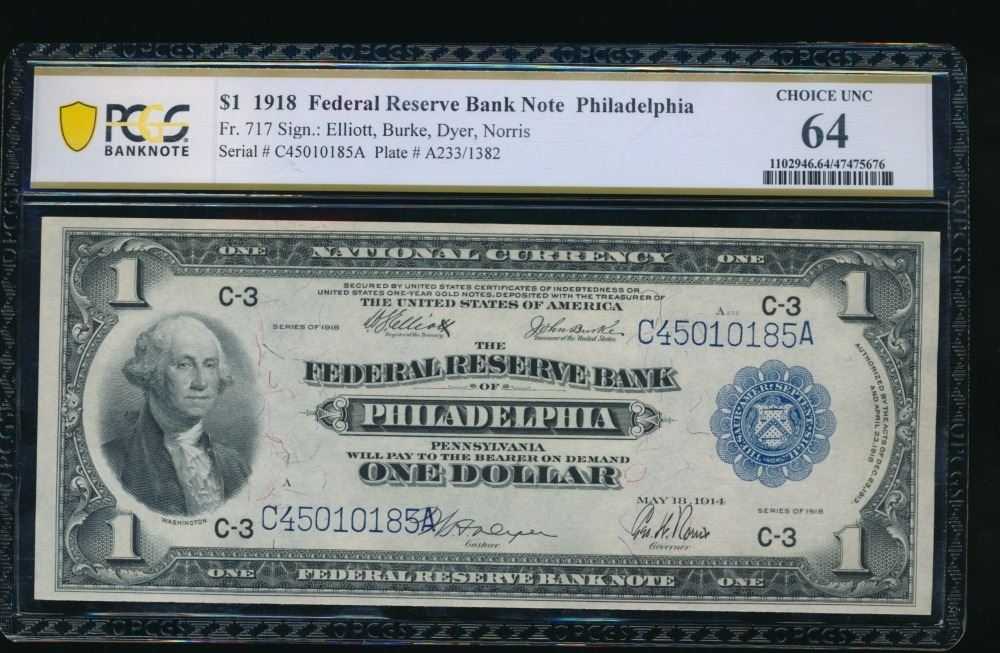 One 1918 $1 Philadelphia FRBN PCGS 64.