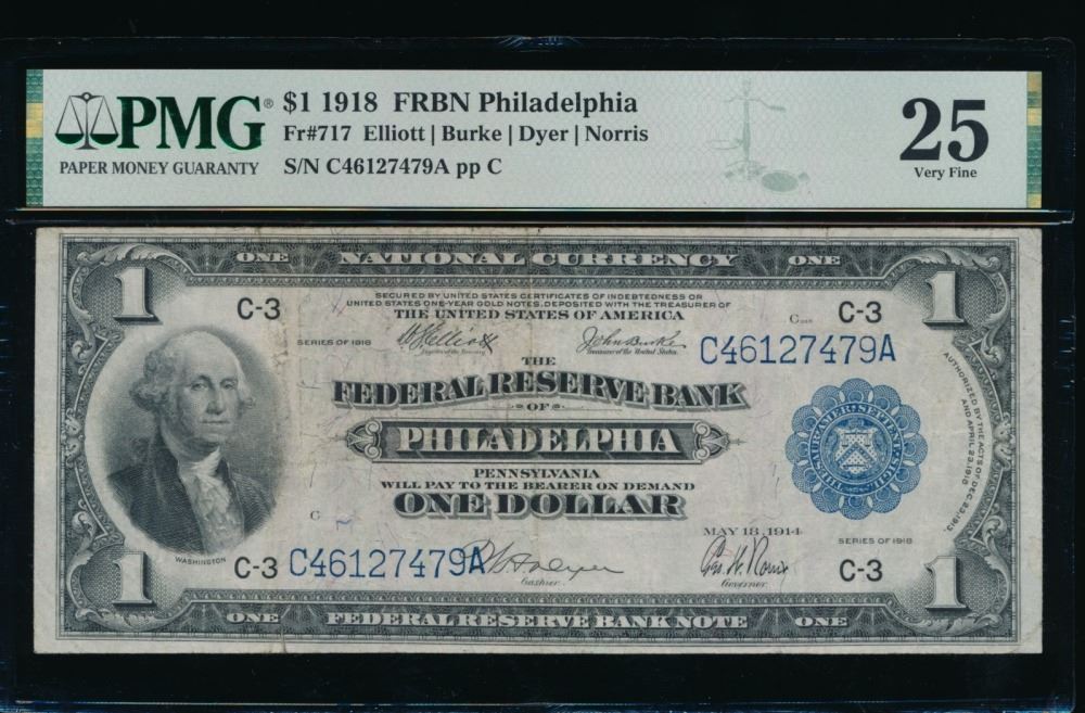One 1918 $1 Philadelphia FRBN PMG 25.