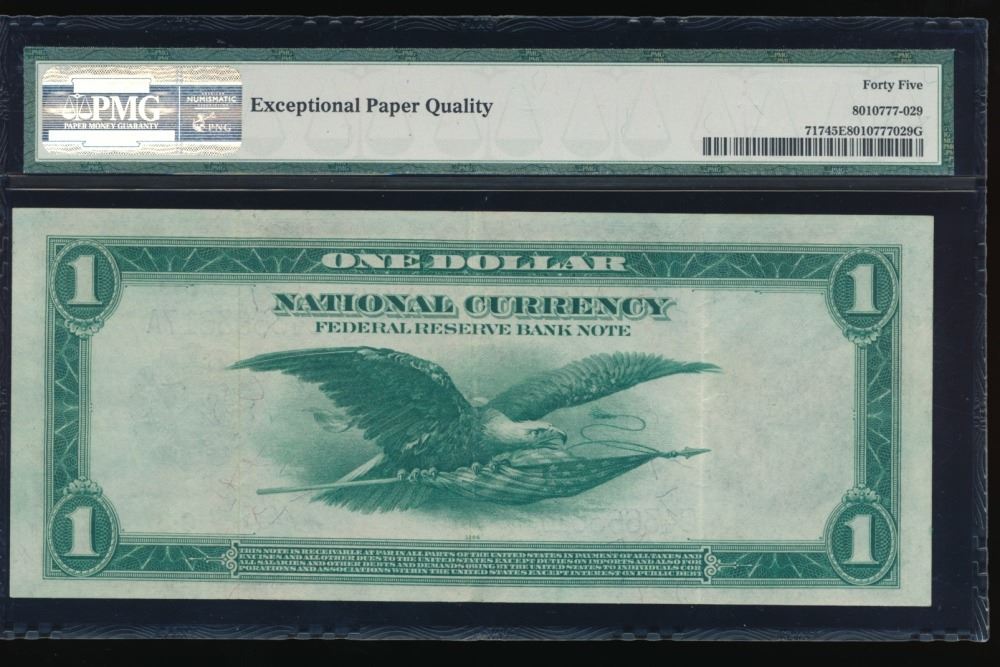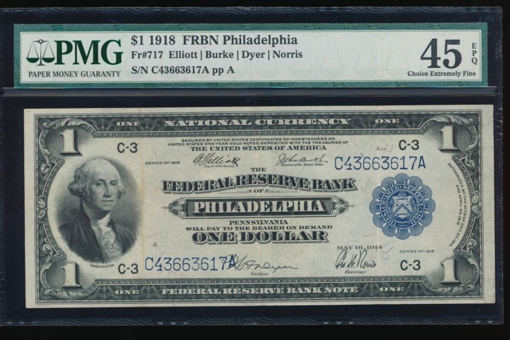 One 1918 $1 Philadelphia FRBN PMG 45EPQ.