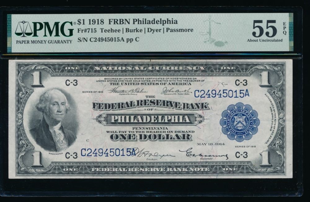 One 1918 $1 Philadelphia FRBN PMG 55EPQ.