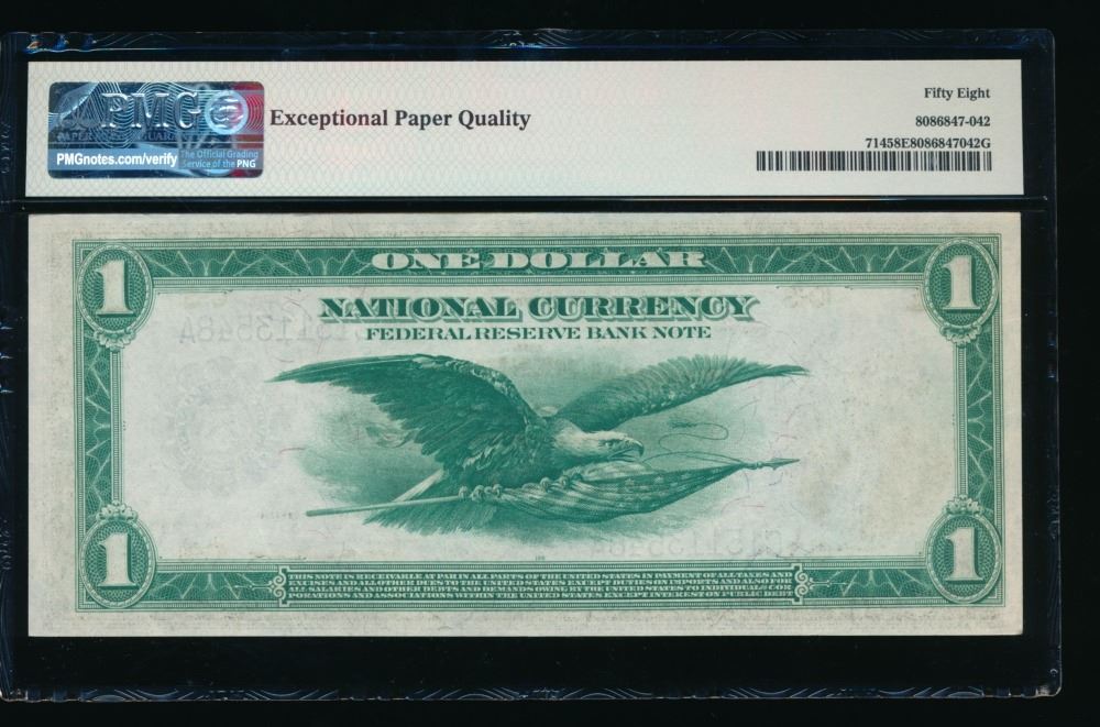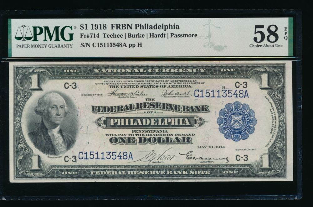 One 1918 $1 Philadelphia FRBN PMG 58EPQ.